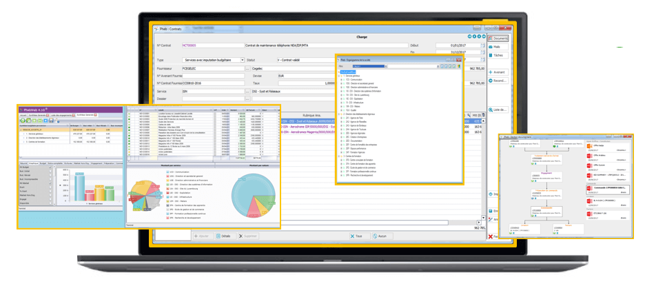 PheB est une solution modulaire qui se situe au cœur de votre gestion financière. Entièrement conçue autour de l'idée d'optimisation des flux de données au coeur d'une GED transversalle (Gestion Electronique de Documents), PheB permet à vos équipes de faire remonter des informations précises et sous contrôle autour de trois pôles principaux que sont la gestion des BUDGETS, la gestion des ENGAGEMENTS et la gestion des ACHATS.